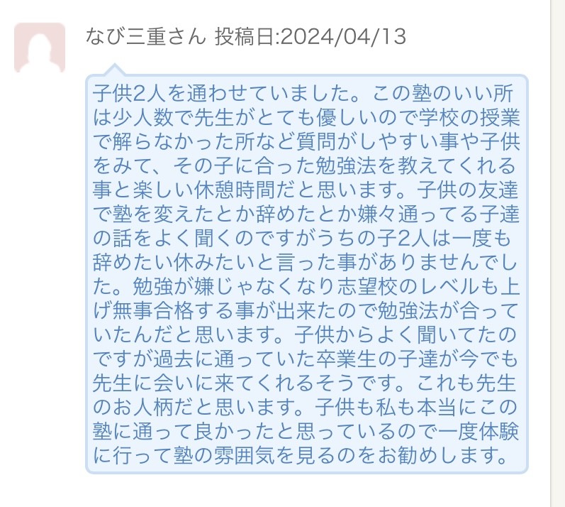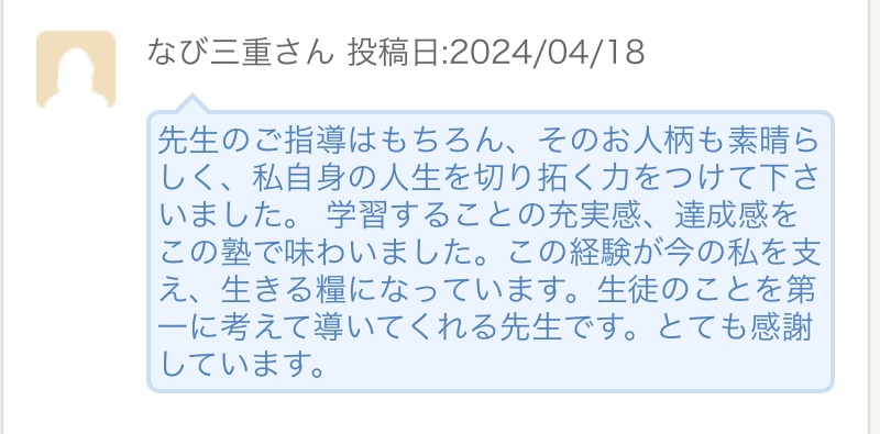 [なび三重]というサイト上で、当塾の口コミが何件か投稿されているのですが、特に胸を打たれた、2つの投稿をご紹介致します。 苦労が多い割に、心報われることが少ない、感情労働(頭脳労働ではなく)なのですが、このような文章を目にすると、心が潤わされる思いがします。 素晴らしい口コミを、ありがとうございました😊😭🙇 シェアする