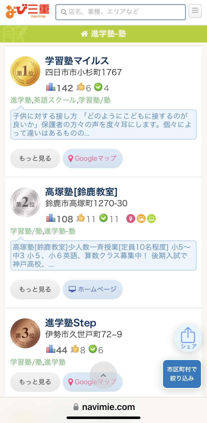開塾以来、近くに住む生徒だけを対象にして、24年間続けて来た当塾が、昨年の夏、初めてホームページを作成して、四日市市内のランキングで何故か1位となり、遂には三重県内でも1位となっていたことは、非常に光栄でうれしく思う以上に、何とも不思議な感覚がそれを上回っています。 検索、閲覧して下さった皆様方、ありがとうございました! 本当にありがとうございました(涙)。 シェアする