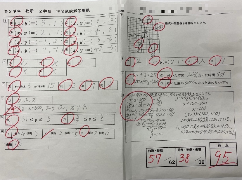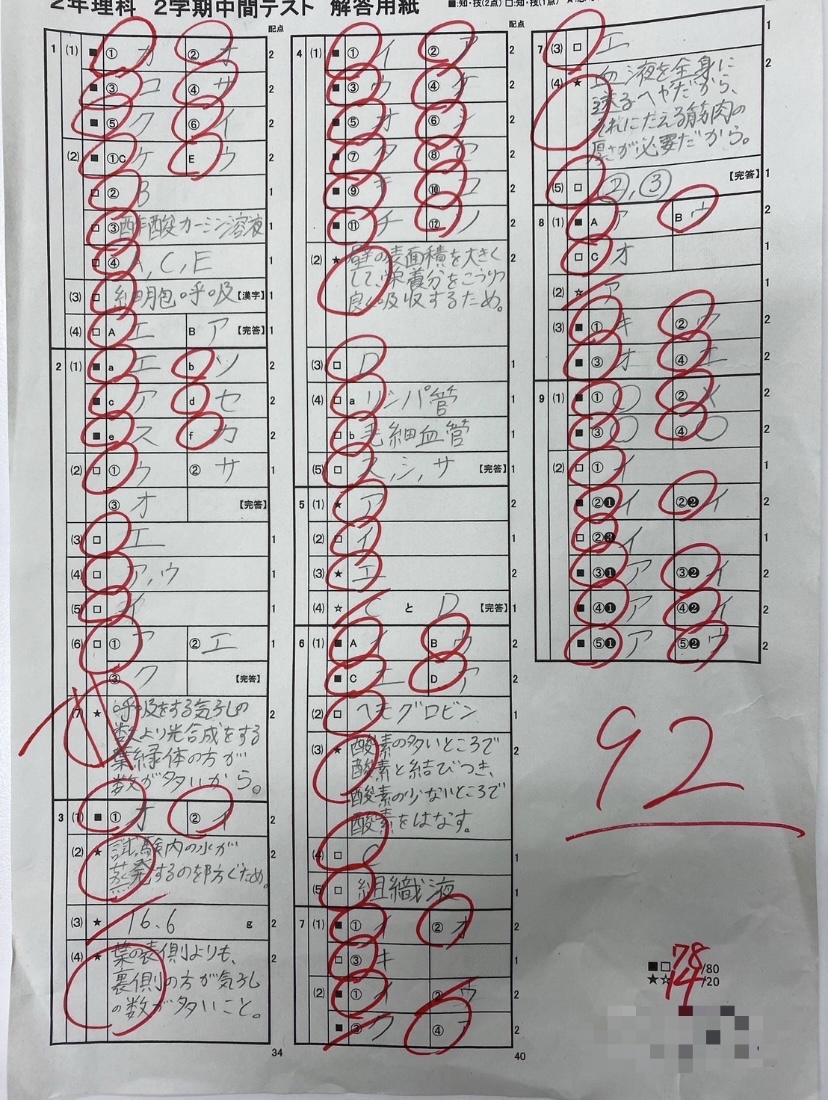 遅くなってしまいましたが、中学2年生の2学期中間テストの90点以上の結果です。 通常、教室内では90点以上のみを張り出しているのですが、今回は、一人の生徒が大幅アップの82点を獲得することが出来たので、いつもの2名に加えて、その生徒のテストも壁に張り出してあります😃 シェアする