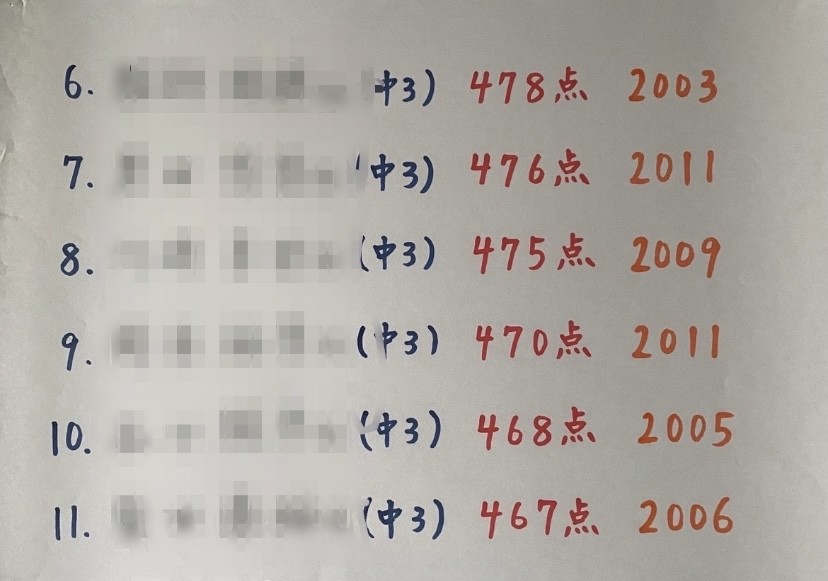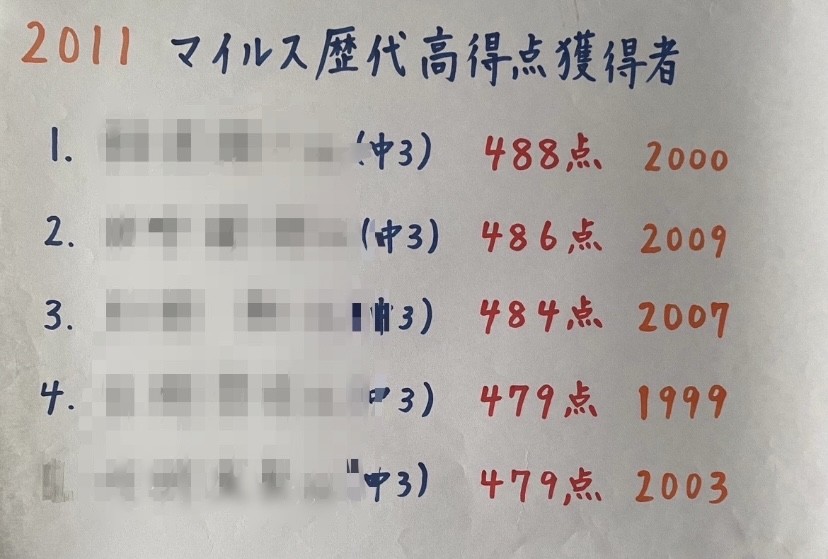 1位〜4位(同得点2名)、10位、11位の生徒は、四日市高校に進学。 また、1,4位(そのうち1名)、11位の生徒は、名古屋大学に進学。 2位の生徒は京都大学、3位の生徒は東京大学へと進学しました。 6位の生徒は中3の成績が全9教科オール5で、7位の生徒は、中学3年間、全9教科オール5という驚異的な成績を収めていました。 全面的な壁の塗り替え等、リフォームを行う前は、壁一面に成績優秀者を張り出していました。シェアする