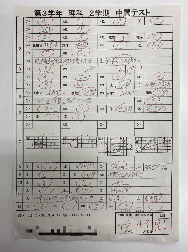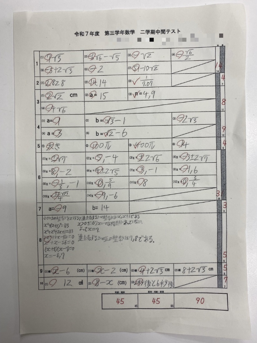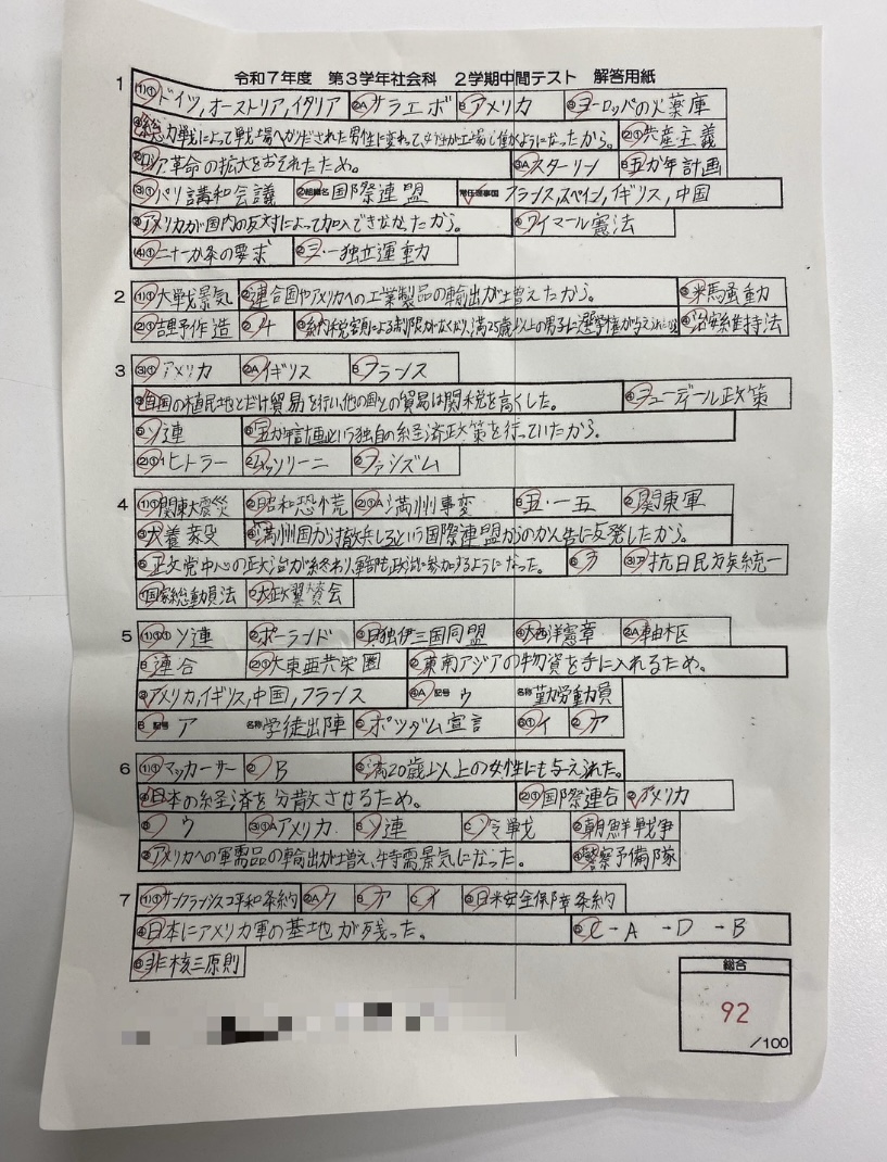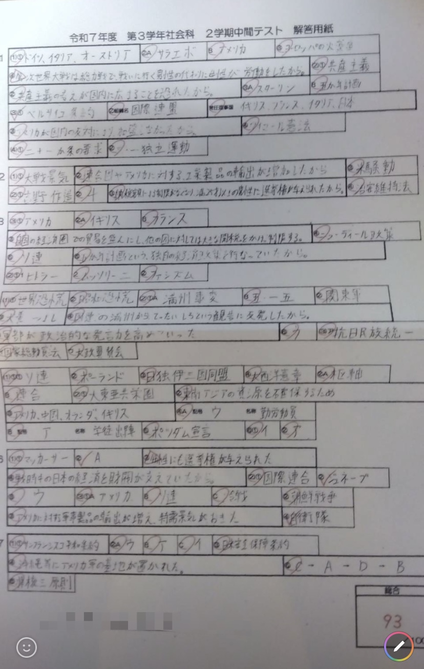 更にもう一人の生徒は、中3から仲間に加わり、今回、これまでの中学校生活での5教科最高得点(社会93点)を取ることが出来ました✨💮