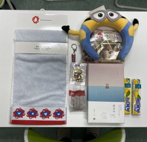 広島の紅葉まんじゅう、ユニバーサルスタジオのミニオンの被り物(?)、ピンバッジ、おみくじ型のキーホルダー、万博のフェイスタオル、そして瀬戸内地方限定のハイチュウを、中1、中2生徒達のためにと、彼等にまでお土産を買って来てくれました。