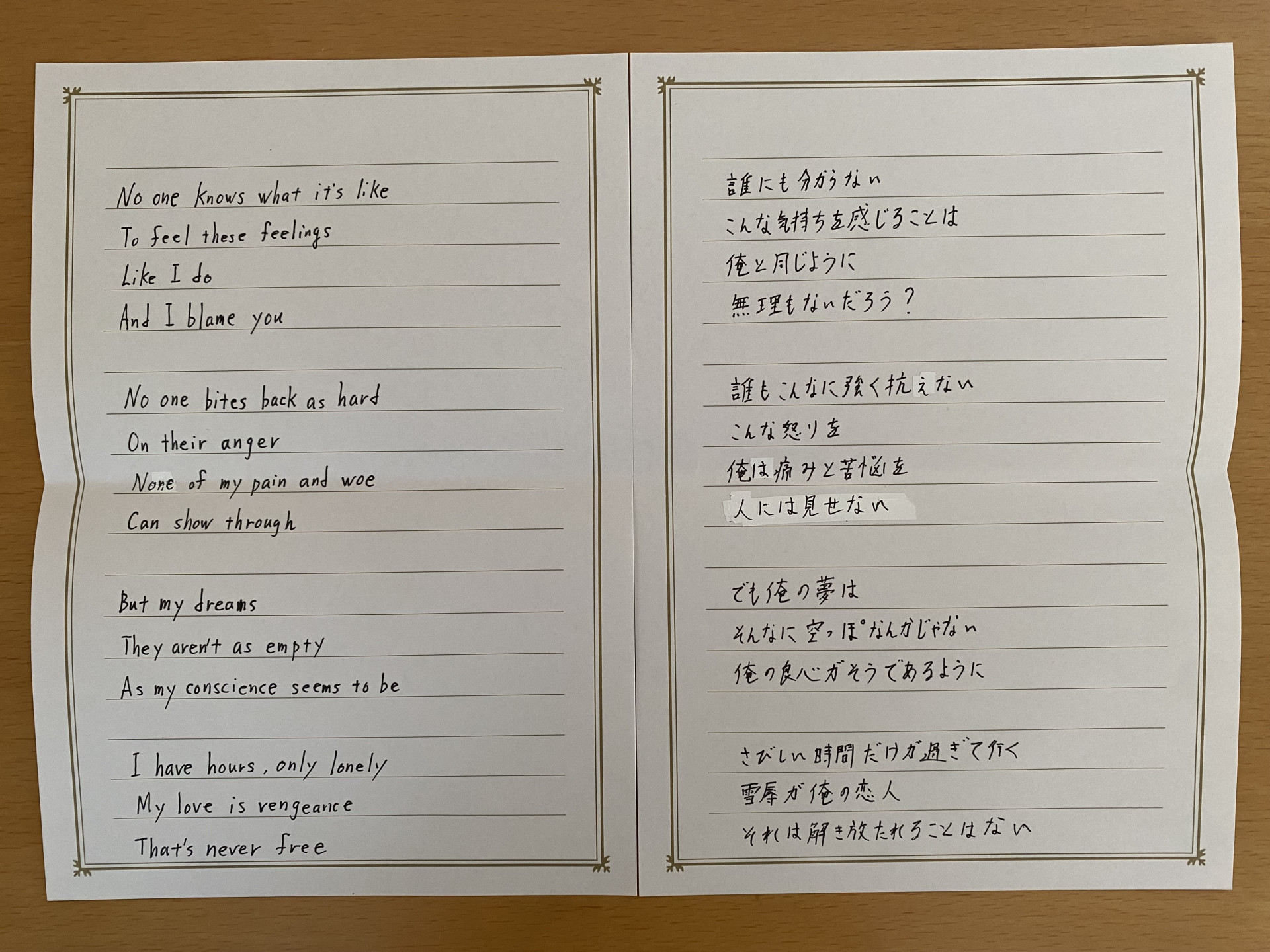 学校で習うような通常の英語力だけでなく、曲を書いた人物の為人や、その時代の背景、文化、その国の歴史等も考慮して和訳しなければ、伝わるものがない稚拙な和訳となってしまうので、文脈的な流れ、それを彩る演奏の抑揚にも気を配り、日本語にしました。