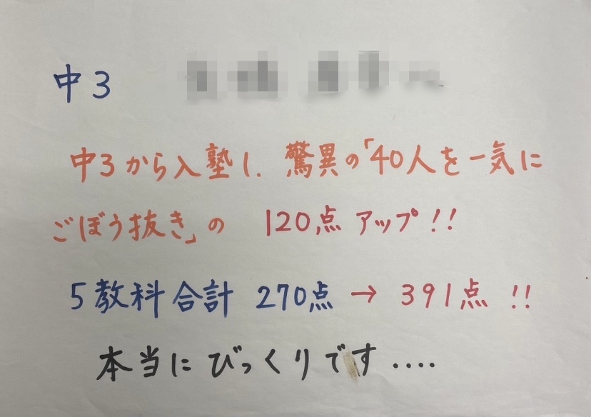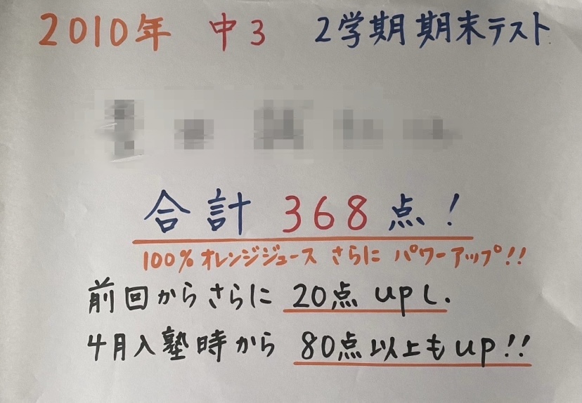 それで、教室内のプリントの山を探し回ったところ、200点代だったにも関わらず、中3の4月に入塾して、400点近くまで成績が上昇した生徒の記録が出て来ました。