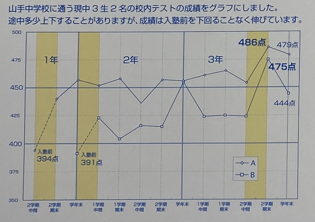 写真の折れ線グラフは、Google にクチコミをしてくれたTKくん、KKくんの、中3時の成績の推移です🎉🎉